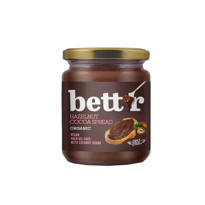 Bett’r Organic Hazelnut-Cocoa Spread – vegan, organic, rich and creamy. Perfect for toast, fruit, or snacks. Made with hazelnuts, coconut sugar & cocoa for a guilt-free indulgence.
